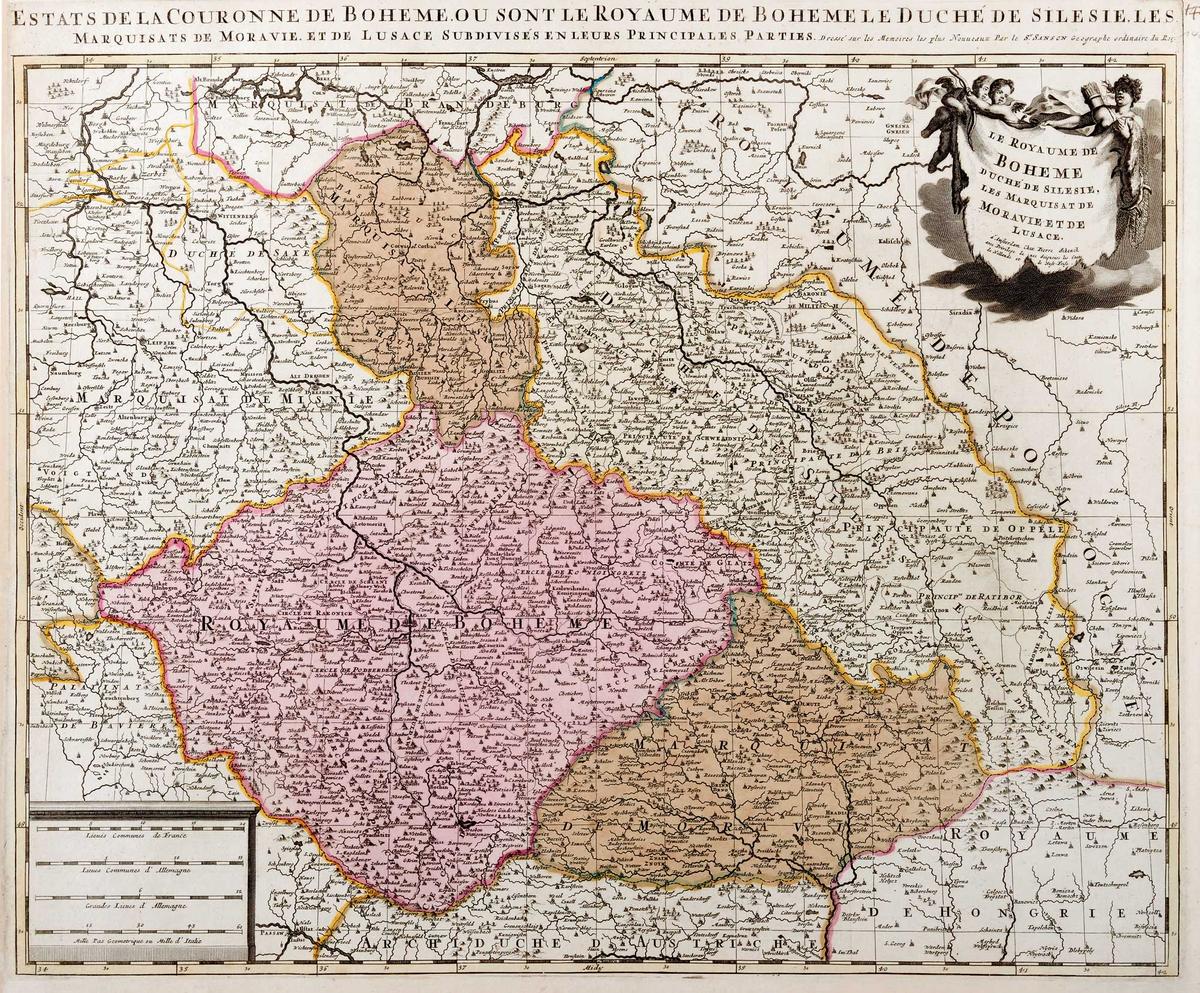Karte von Böhmen, Mähren, Schlesien und der Lausitz, kolorierter Kupferstich von Nicolas Sanson, Peter Schenck (Verlag), Amsterdam, [17. Jh.].